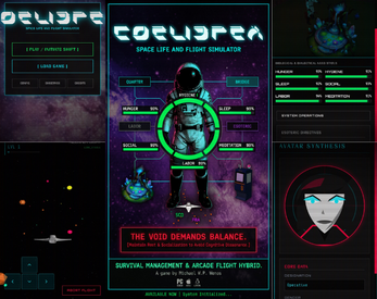 COELISPEX is a lo-fi, atmospheric hybrid of a survival-management sim and a retro-arcade flight shooter. Set within a dithered, neon-soaked cyberpunk universe, players take on the role of an Operative stationed aboard a Proletarian Space-Pod.