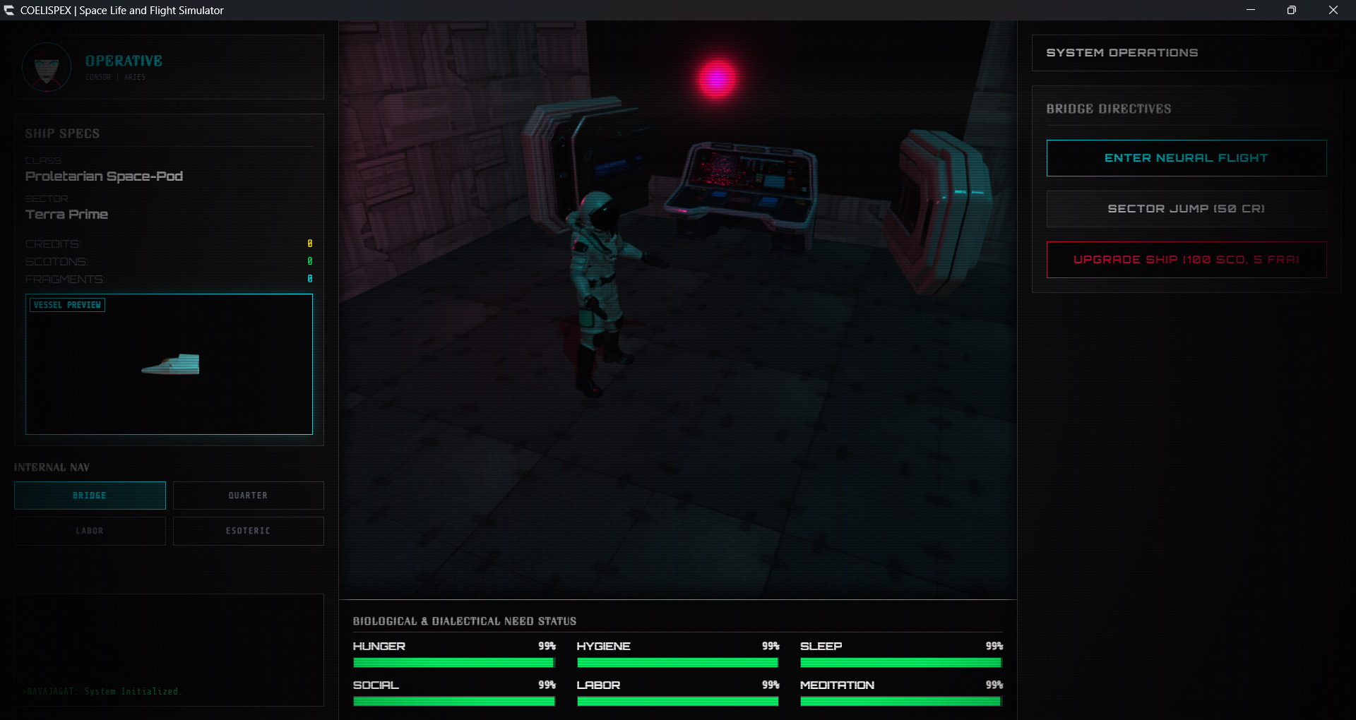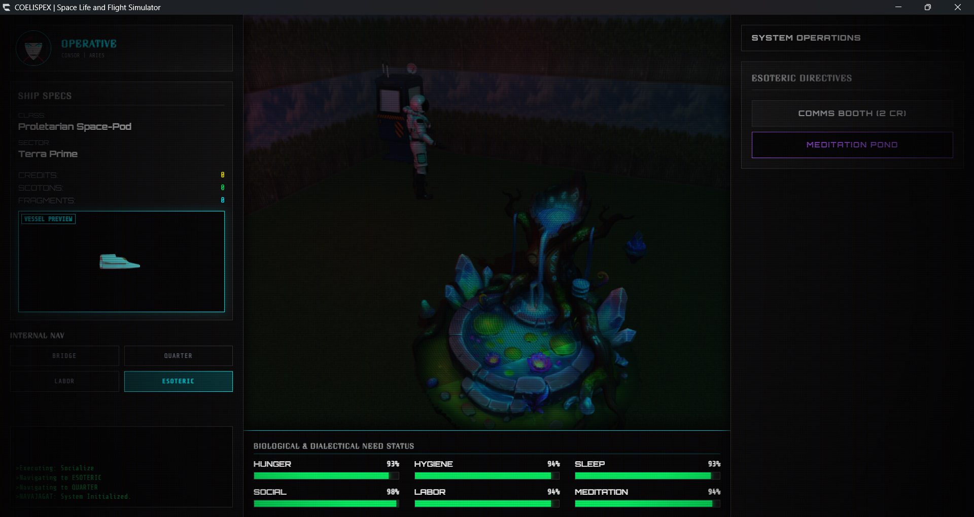 Manage your existence within the cramped confines of your vessel. Monitor your Biological & Dialectical Need Status, which includes Physical Maintenance (Hunger, Hygiene, Sleep) and Psychological Maintenance (Socialization, Labor, Meditation).