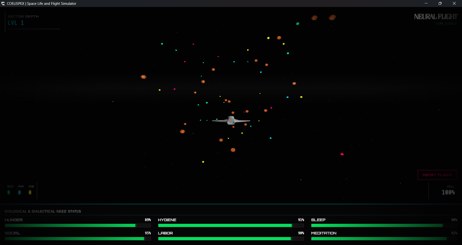 When you "Initiate Shift," you enter Neural Flight. This shifts the perspective to a top-down arcade shooter where you pilot your craft through space, dodging hazards and collecting resources like Scotons (SCO) and Sophia Fragments (FRA). Use these resources to upgrade your ship from a basic pod to a formidable vessel.